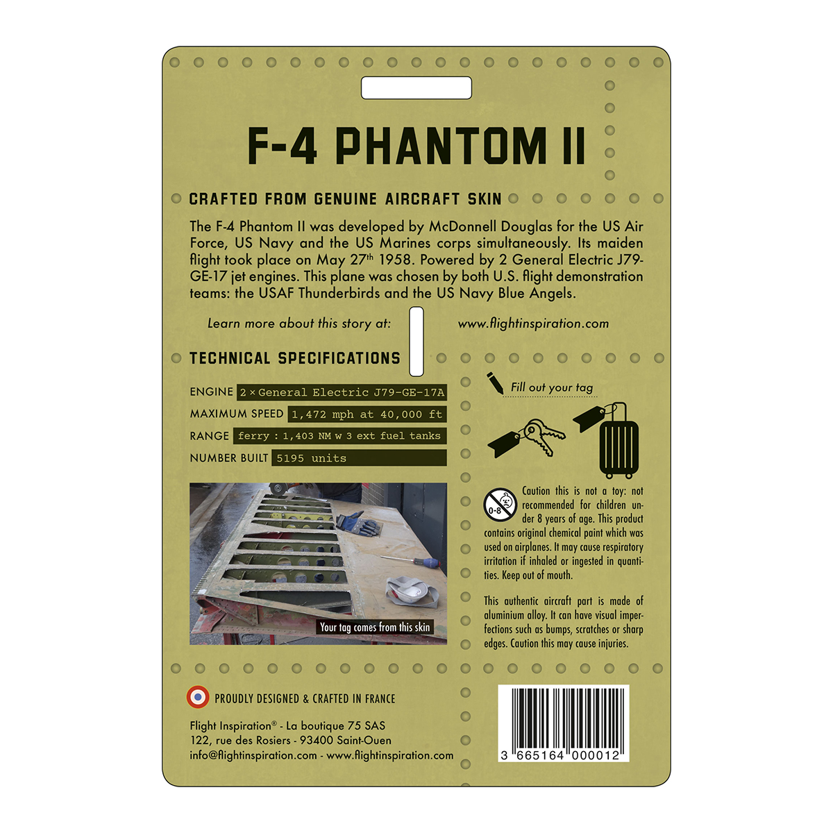 Voici un authentique fragment de F-4 Phantom II, avion militaire de légende qui a fait la renommée du constructeur américain McDonnell Douglas à travers le monde. Sa carrière commence à la fin des années 1950 alors que les États-Unis s’enfoncent dans la guerre du Viêt Nam. Ce conflit de vingt ans mobilisera le F-4 Phantom II comme aucun autre chasseur ne l’avait été jusqu’alors. De l’U.S. Navy à l’U.S. Air Force en passant par les armées de l’Iran, de la Turquie, de la Grèce et du Japon, la carrière du Phantom s’inscrit dans un contexte géopolitique lourd et complexe : celui de la guerre froide.